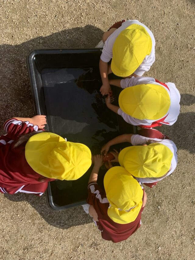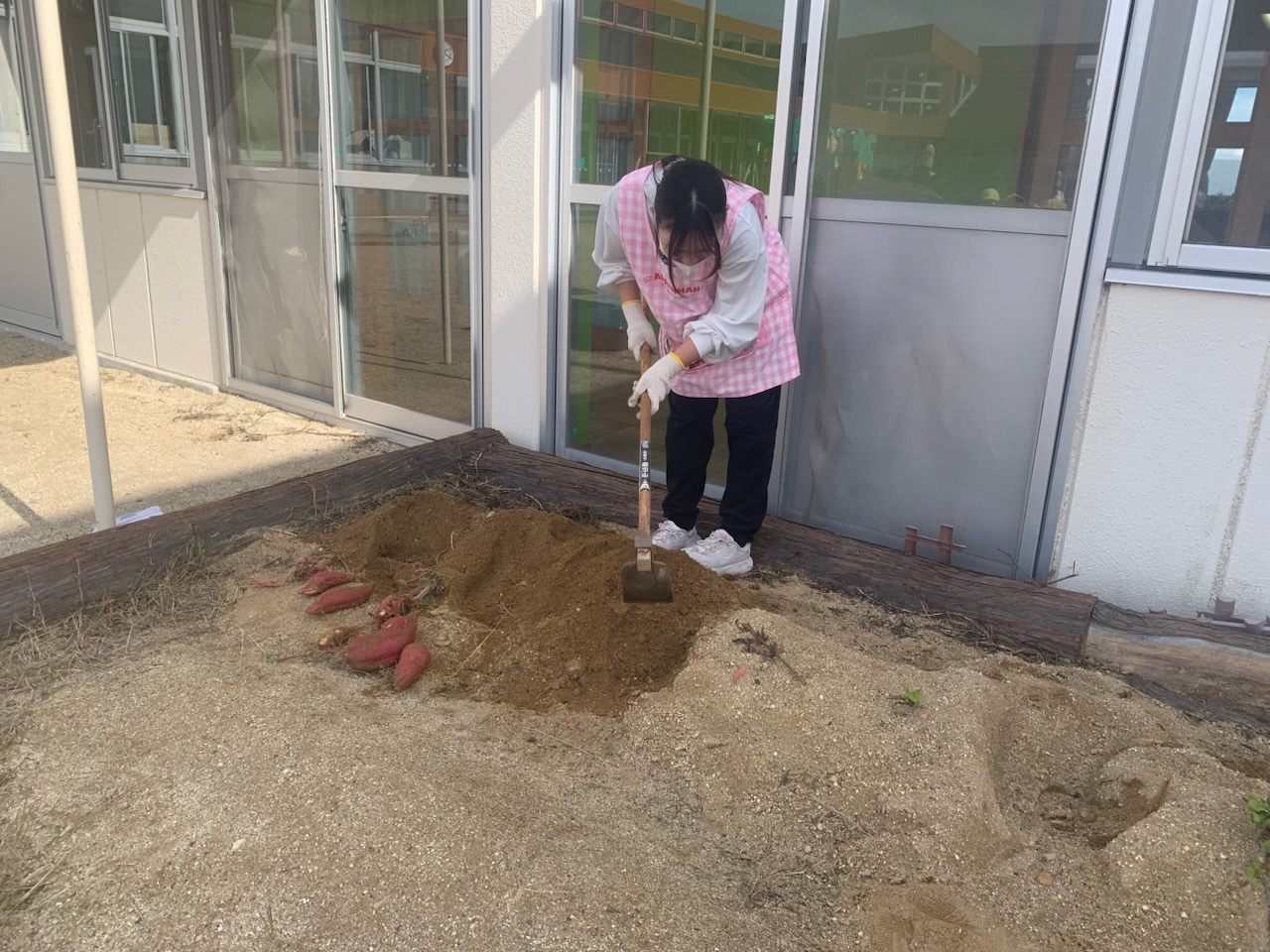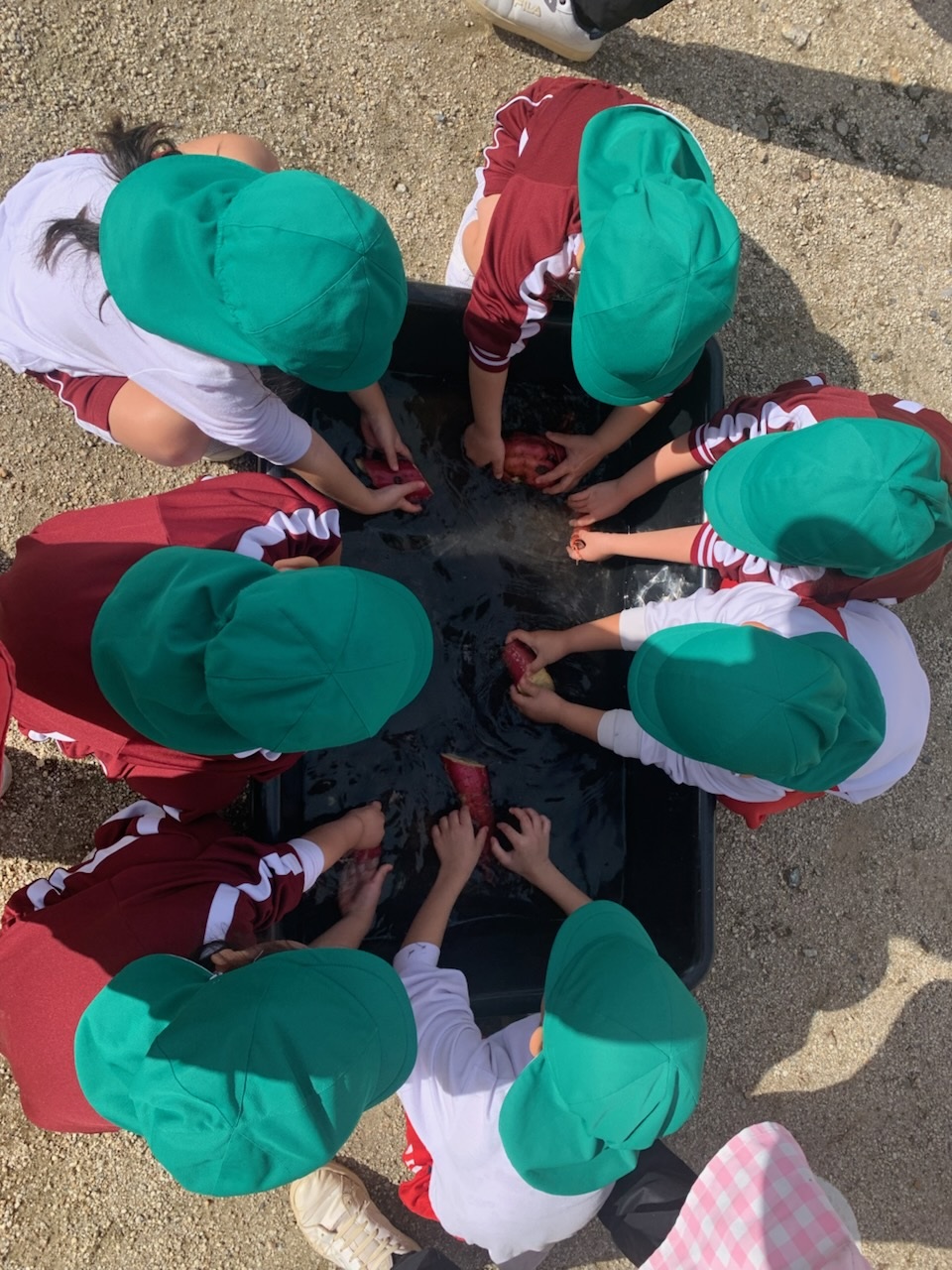 畑のお芋を年中組で掘ってみました。保育者が掘って見せます。すると、ゴロゴロっとお芋が出てきました。こどもたちも大喜び!お芋を持ってきれいに洗います。みんなで食べる程の数が無いので、今年度はこのお芋を使ってお芋スタンプをして楽しもうと思っています。