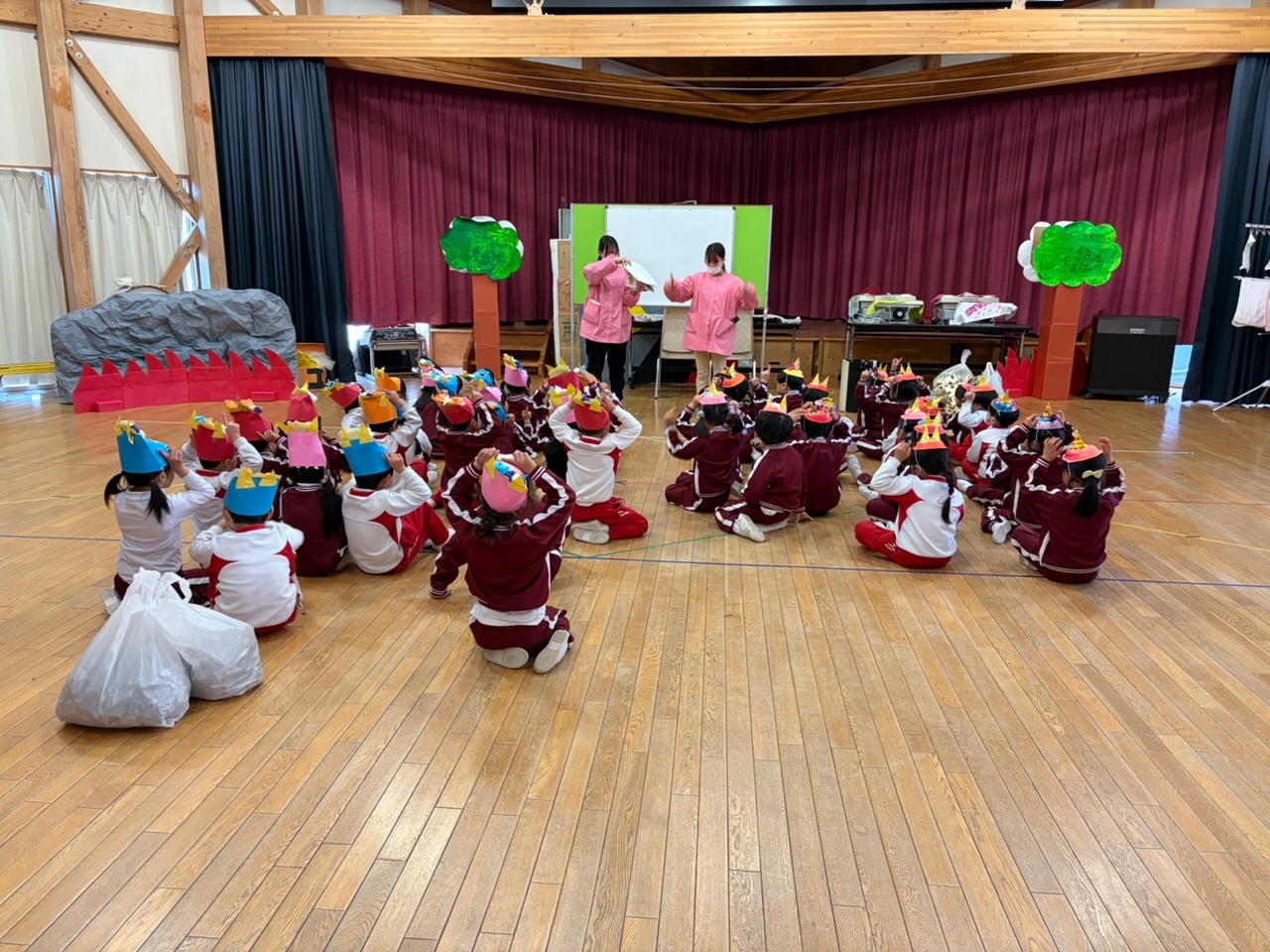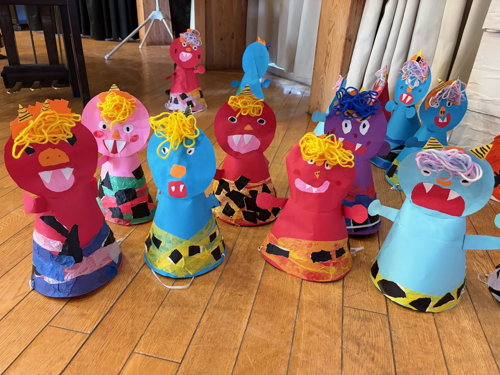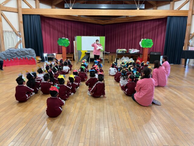 今日は節分という事で各学年豆まき会をしました。ユーモアあふれる鬼のお面がたくさんありました。先生たちがスケッチブックシアターで節分の由来などをわかりやすく伝え、鬼役、豆をまく役にわかれて先生たちも一緒になって楽しみました。みんなの心の中にある弱い鬼を退治できたかな?