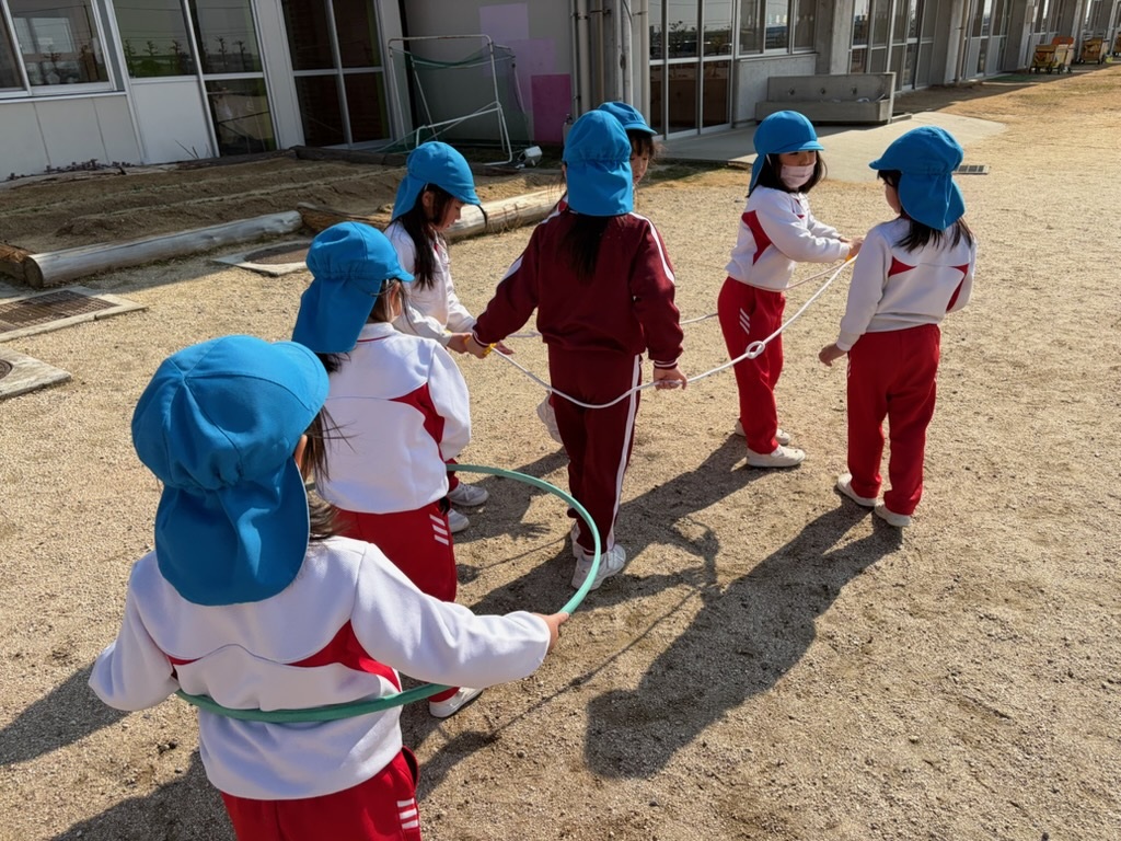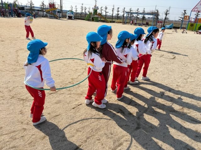 園庭でこどもたちと一緒に遊んでいると年長組の子たちが縄跳びを繋げて電車ごっこをしていました。始めは窮屈なくらい入っていましたが、自分たちで考えて電車を作り上げていました。最終的には、フラフープをくっつけるといいかもと言ってフラフープも繋げて遊んでいました。みんなでアイデアを出し合って楽しい電車ごっこが出来ました。