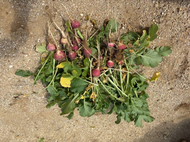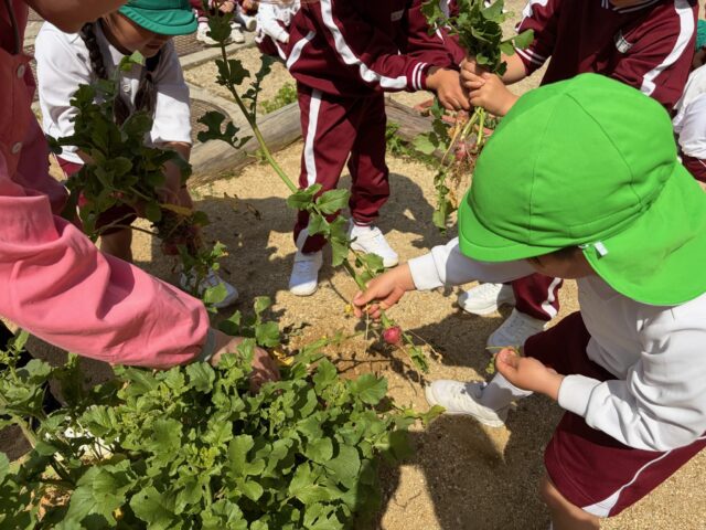 年中の時に育てたラディッシュが収穫時期になりました。こどもたちも年長になり新しいクラス、担任の先生とラディッシュを収穫しました。こどもたちのイメージと実物が違ったのか「ちいさいね」と言いながら抜いていました。これから食育で調理していきたいと思います。どんな味がするかな?
