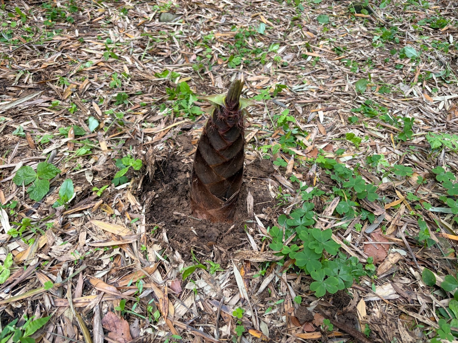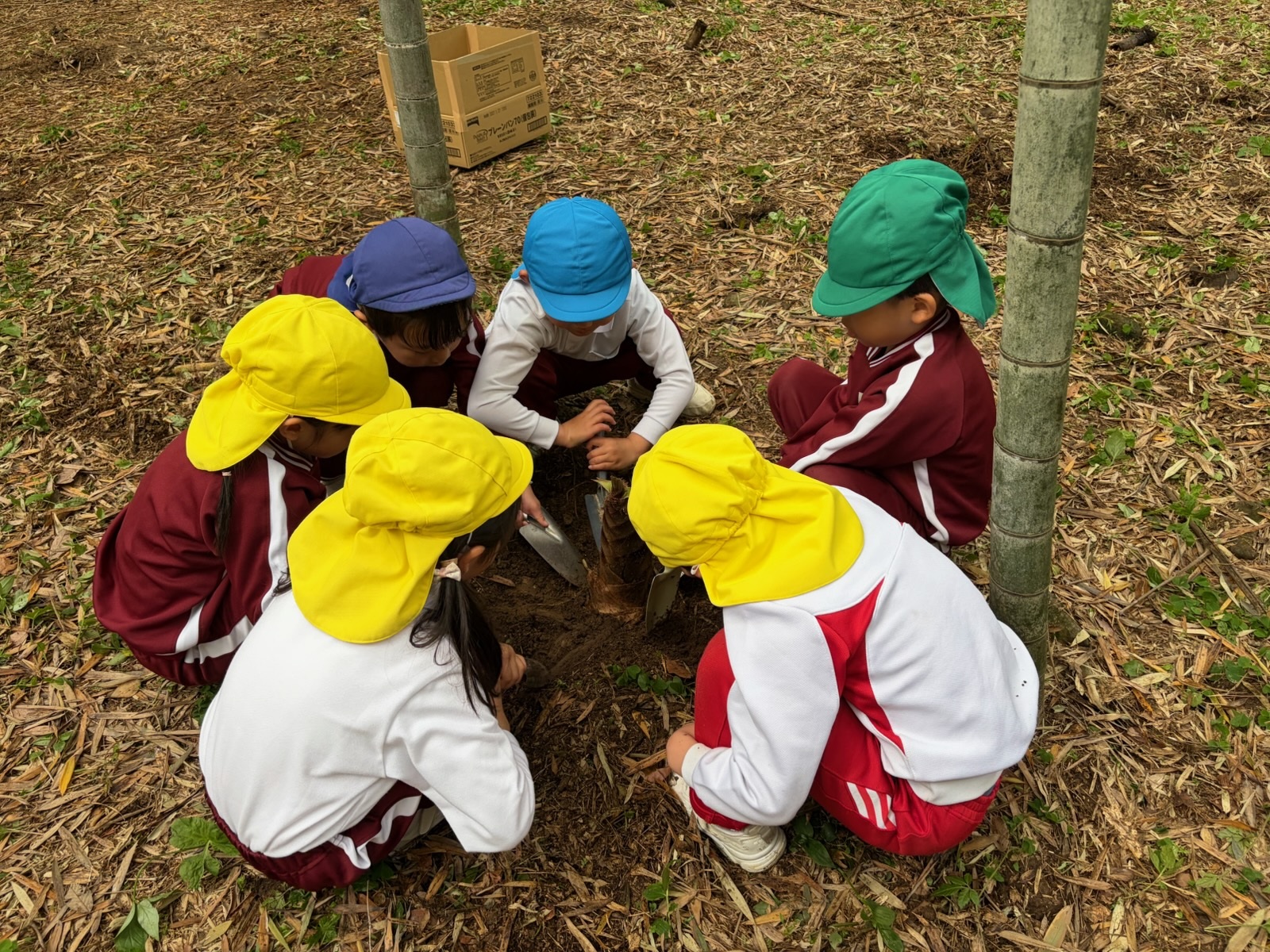 とても天気が良く気持ちのいい日でした。年長組のみんなでたけのこを掘りに行きました。山を登り、たけのこを探します。見つけるとスコップで一生懸命掘っていました。雨上がりでたけのこも柔らかくこどもの力でもスポンと抜けました。採れたたけのこは、来週アク抜きをしていただきます。たけのこご飯も出来たらいいなと思っています!