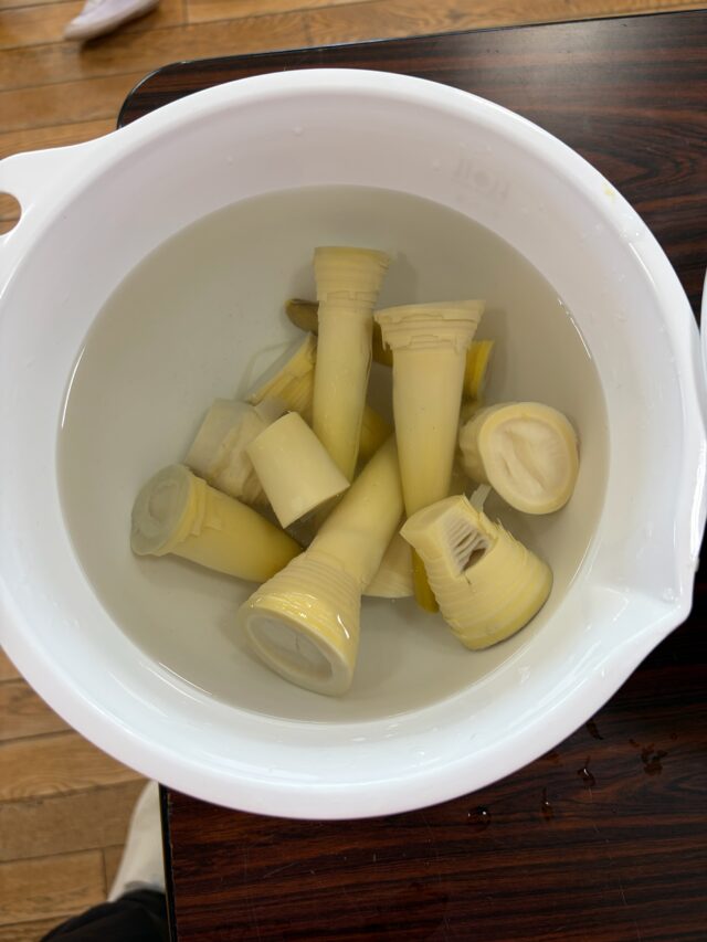 午後皮をむいたたけのこを茹でて食べてみました。【とうもろこしのにおいがする】や【いいにおいがする】と様々な意見が出ました。