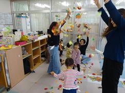 今日の初めてのリトミックは、落ち葉あそびで楽しみました