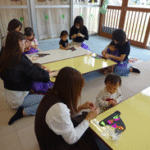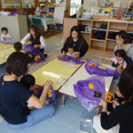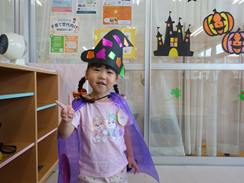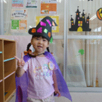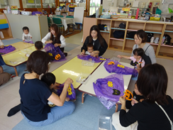 今日のトコトコひろばは、ハロウィンのマントと帽子を作りましたマントには、カボチャやねこキャンディーを貼って帽子にはキラキラシールを貼りました