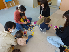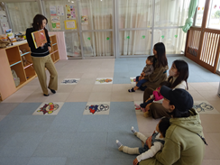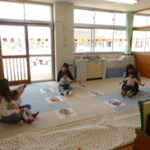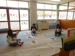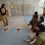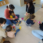 今日の初めてのリトミックは、「さつまのおいも」の絵本を見たあとお芋ほりの音あそびをしました。紙を使って叩いたり、破ったりして音を出し最後にお芋ができあがりました