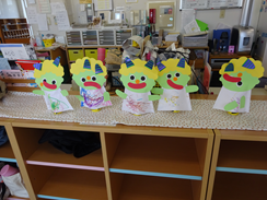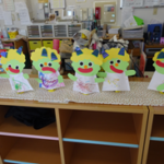 トコトコひろばは、目、鼻、口、つのシールで貼って鬼のパペットを作りました