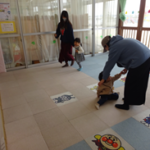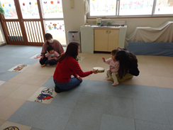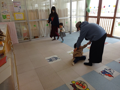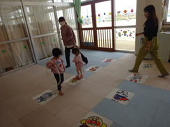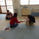今日のリトミックは、親子でフープを使って音楽にあわせて体を動かしました