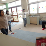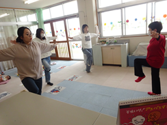 お子さんから少し離れてママたちは、バランス体操などで体を動かしました