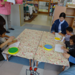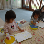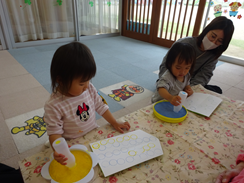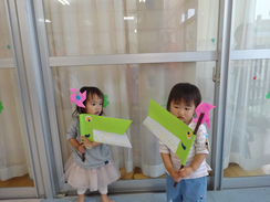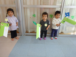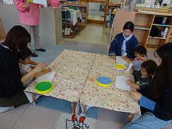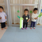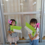 今日のグングンひろばは、ヤクルトの容器でスタンプをしてこいのぼりを作りました