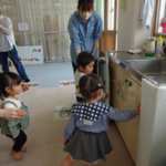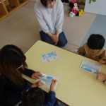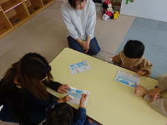 今月のテーマは、「数」でした。はらぺこあおむしのパネル貼りをして果物を先生と「one・two・three」と数を数えたり「apple・bear・cat」を探したり楽しんで英語に触れました